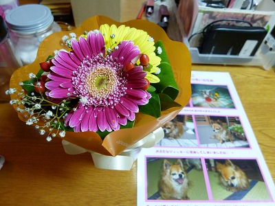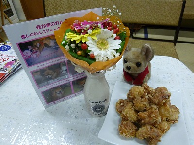 (お花と唐揚げ頂きました~!みんなありがと~!)記念撮影
