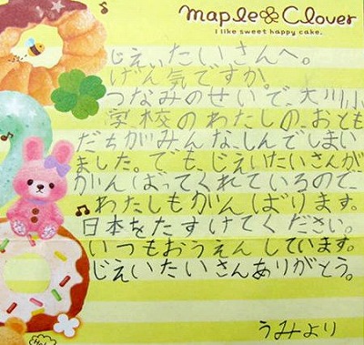 この手紙は、被災した子供が自衛隊の隊員に宛てたもの。