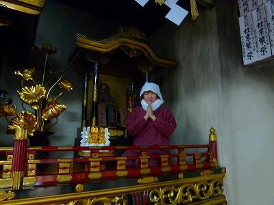 こんな格好で~神殿のご尊像を定位置におさめるお手伝いの為神殿に上がりました。