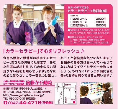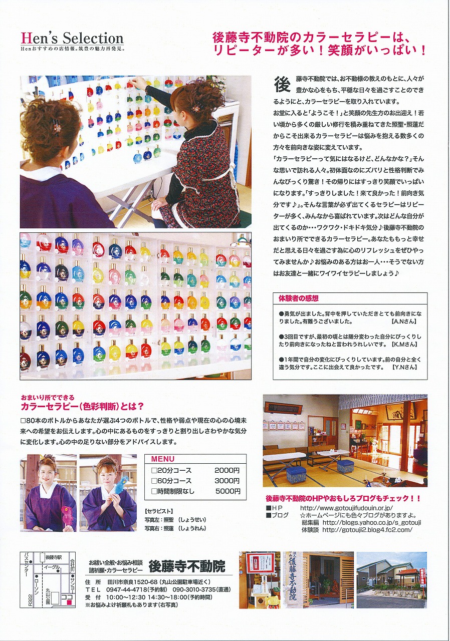 地域の情報誌「hen」に後藤寺不動院の<おまいりしょでできるカラーセラピー>