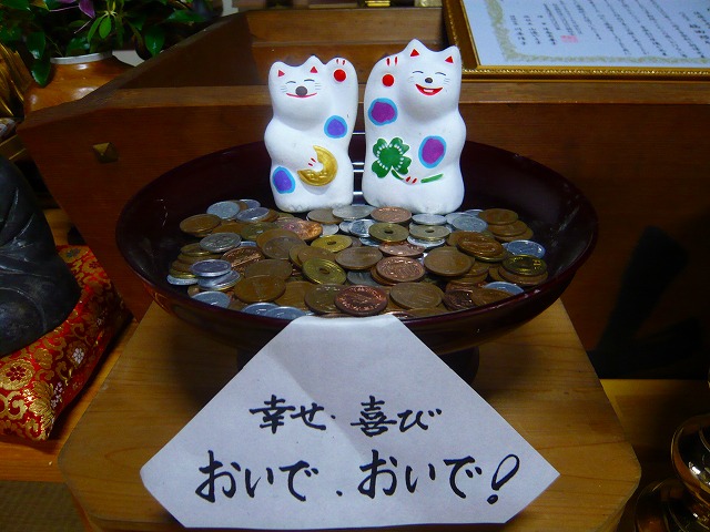 お堂のお賽銭箱のところに置いてある招き猫ちゃん