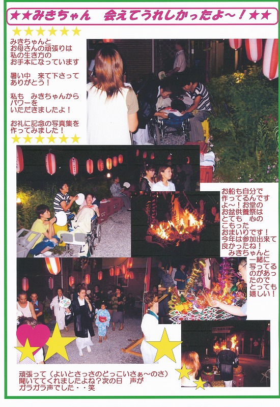 けれども私の出会った美紀ちゃんは、自分の障害を受け入れ、辛い思いを乗り越え、生涯を笑顔で生きぬきました。 とても、誉めてさしあげたい!そして美紀ちゃんを支え続けたお母さん、ご家族の方も誉めてさしあげたい!あなた方の愛情があったからこそ、美紀ちゃんもがんばれたのです。